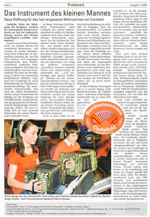Für die kleine Erzgebirgsgemeinde Carlsfeld, die heute ein Ortsteil der Stadt Eibenstock ist, ist das ein bedeutendes Ereignis. Denn hier wurden von 1864 bis 1964 Bandonions hergestellt, die wegen ihrer hohen Qualität bei Künstlern in aller Welt einen ausgezeichneten Ruf genossen und den Ort in der internationalen Musikszene bekannt machten, Die Firma Alfred Arnold exportierte z. B. 1933 85 Prozent ihrer Produktion mit dem Firmenlogo AA nach Südamerika, wo das Bandonion als das Instrument gilt, mit dem der Tango am besten interpretiert werden kann. Noch heute sind weltbekannte Künstler stolz und glücklich, ein Instrument mit dem Markenzeichen AA zu besitzen. In vielen Häusern spielte man damals Bandonion. Doch die Produktion wurde 1964 eingestellt. In Carlsfeld schien die Bandonionmusik für immer verstummt zu sein.